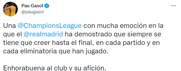 前湖人夺冠功臣保罗-加索尔也发推祝贺皇马夺冠。