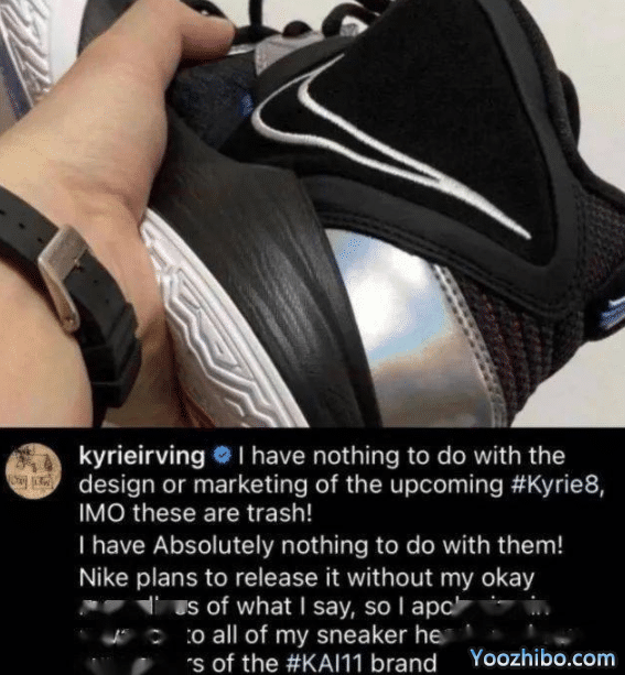 此前欧文就和自己的球鞋赞助商耐克闹得剑拔弩张,欧文八代出来的时候,欧文就怒斥耐克在不经过他同意的情况下发布,还朝着球迷道歉等等。