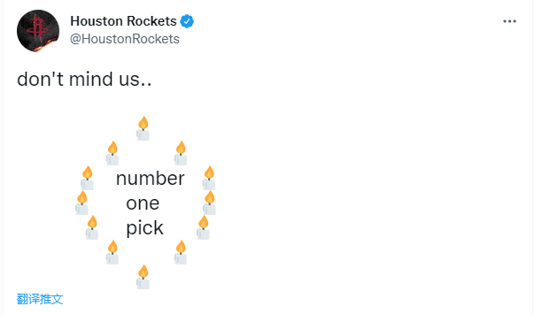 本赛季,火箭的战绩是20胜62排名联盟倒数第1,拥有14%的概率获得状元签,52.1%的概率拿到前四顺位签位;抽签仪式之前,火箭官方发推祈祷抽中状元签,火箭官推发了12个蜡烛表情包围成了一个圈,中间写着:状元签!还配文写道:别介意我们!