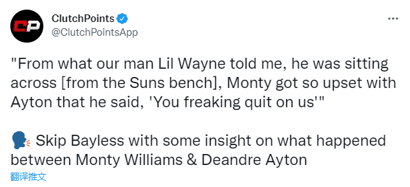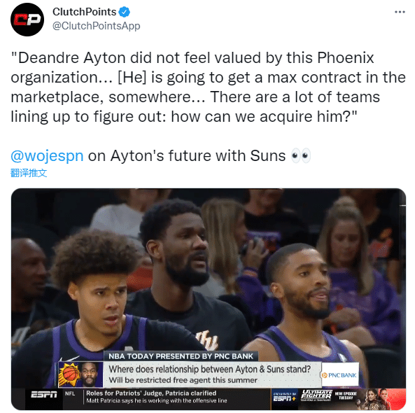 谈到艾顿是否是太阳长期计划的一部分,蒙蒂表示:艾顿的情况是我们今年夏天要处理的事情。我现在不想说任何关于这件事的事情。詹姆斯-琼斯(太阳总经理)和我将就整个球队进行对话。