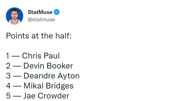 美媒晒出扎心的一幕,太阳的首发五虎上半场得分竟然依次是1、2、3、4、5,其中保罗上半场仅1分!和之前被淘汰出局的雄鹿一样,太阳的三分球太铁了。两支参加上赛季总决赛的球队,竟然在同一天出局,而且都没打进分区决赛!
