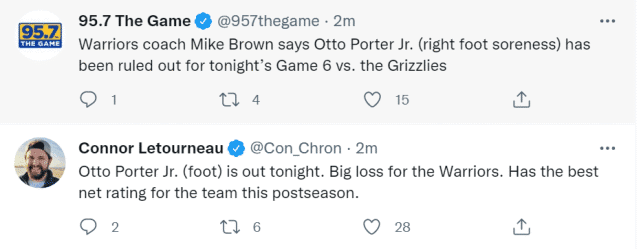 来源:JRS直播05-14 15:52JRS直播05月14日讯 ,勇士代理主教练迈克-布朗宣布,奥托-波特因右脚酸痛将不会出战今天勇士vs灰熊G6的比赛。勇士跟队记者Connor Letourneau表示,勇士遭遇重大损失,波特的净效率值在季后赛排名全队第一。