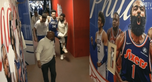 这是首节,恩比德突破上篮打进,他倒地之后正好压在了篮下准备争抢篮板球的丹尼格林的腿上,后者痛苦倒地,恩比德没有太注意,而是自顾自的回防。随后丹尼格林无法坚持,队医进场,丹尼格林回到更衣室治疗。