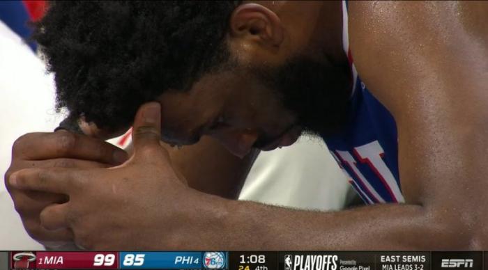 G6还剩1分多钟,恩比德下场放弃比赛,坐在替补席双手抱头十分沮丧,低头失落快哭了;里弗斯则是脸色铁青;赛后恩比德长时间坐在替补席,之后拥抱恭喜巴特勒,不过镜头一直没有拍到哈登,貌似他早已提前离场。