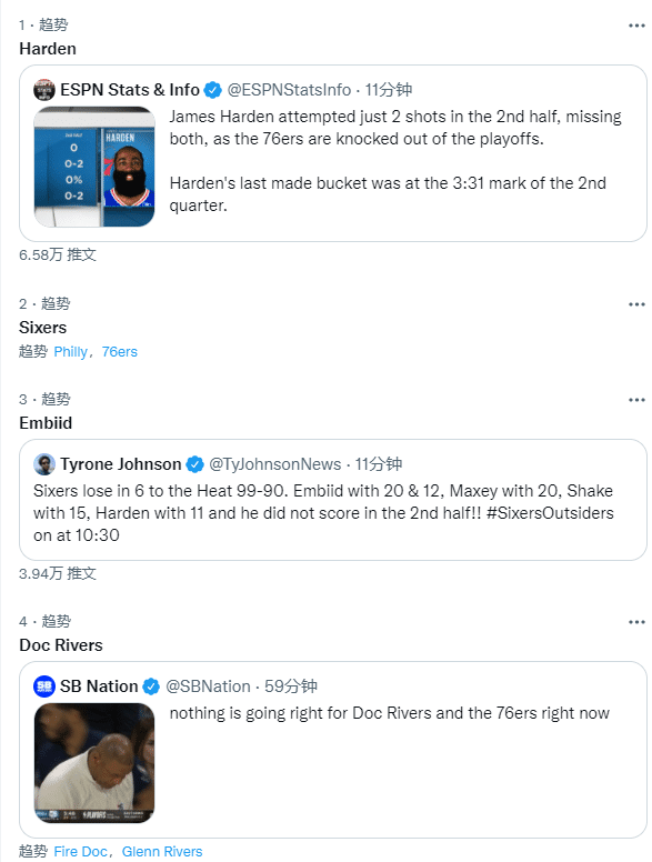 下半场,76人集体哑火,恩比德和哈登投篮不进还失误不断,被热火打出19-4瞬间落后到16分,之后76人追分,无奈第三节15-25净输10分;末节哈登开场被包夹出现失误,热火6-0继续扩大领先,并且一直压制76人,费城主场的球迷沮丧地提前离场,还剩1分多钟,76人换下主力,最终90-99输掉比赛。