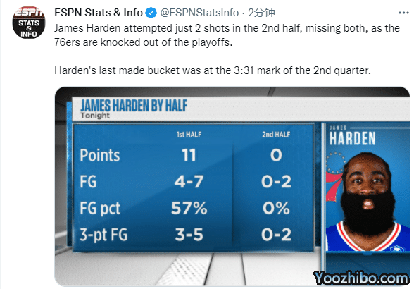 哈登下半场2投0中0分4篮板2助攻4失误,下半场0分坑惨球队,G6生死战,哈登最后一次得分是在第二节3分31秒,之后一分未得,最终76人被淘汰出局,昔日的夺冠豪言沦为泡影。