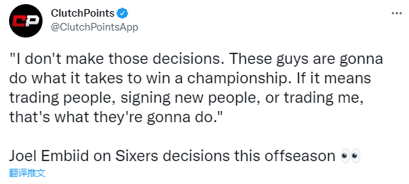 谈到球队需要在哪些方面做出改变,恩比德表示:“我不是总经理,也不是管理层,我不会去做这些决定。他们会尽一切努力去帮助球队赢下总冠军,如果这意味着需要做交易或者是交易我,这就是他们需要做的事,我相信一切都是为了夺冠要做的。