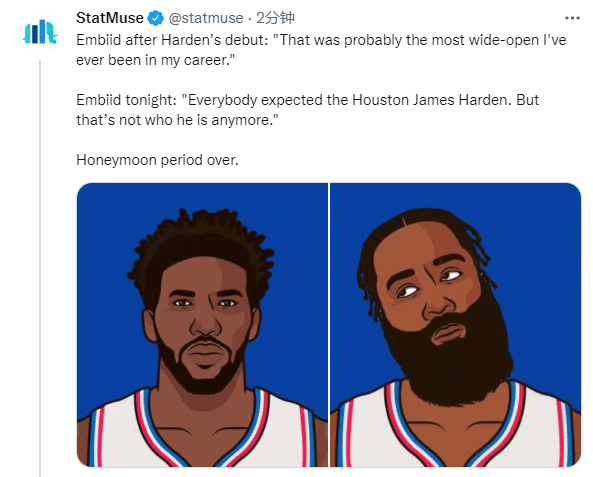 赛后谈到哈登,恩比德表示:很明显,我敢肯定,自从我们得到他后,每个人都期待休斯顿火箭时期的詹姆斯-哈登,但他不再是那个人了。他更像是一个组织者。我有时想,就像我们所有人一样,本来可以打得更具侵略性。