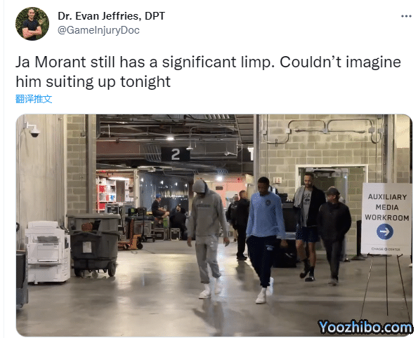 赛前,莫兰特身穿运动装亮相,和队友一边聊天一边走路,仍旧一瘸一拐;医学专家Evan Jeffries发推:莫兰特仍旧有明显的一瘸一拐,无法想象他能参加今晚的比赛;换句话说,专家认为莫兰特将因伤缺席G4;从詹金斯的回答来看,莫兰特应该无法出战。
