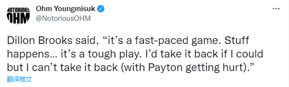 灰熊悍将狄龙-布鲁克斯解禁复出,赛前他对弄伤小佩顿很后悔,谈到自己二级恶犯导致小佩顿受伤,他表示:那场比赛的节奏很快,总会发生很多事,那是一个艰难的回合。如果现在我能回到那一刻并重新选择,我想选择收手,但已经没法收手了,没法弥补(佩顿受伤)。