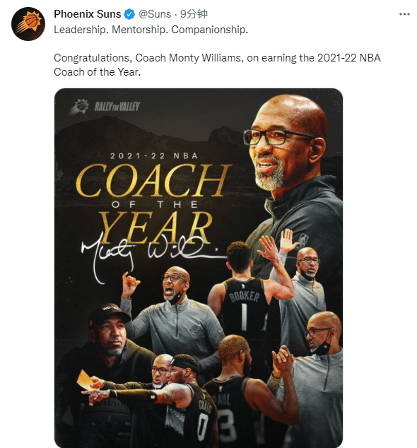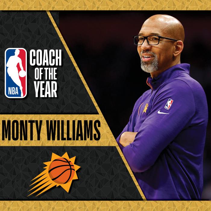 NBA官宣!太阳主帅蒙蒂-威廉姆斯夺最佳主教练创纪录