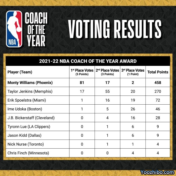 蒙蒂获得81张第一选票、17张第二选票和2张第三选票,总共获得458分;灰熊主帅詹金斯获得17张第一选票,总共270分;热火主帅斯波尔斯特拉72Feb;凯尔特人主帅乌度卡46分,快船主帅泰伦卢9分,独行侠主帅基德9分,猛龙主帅纳斯和森林狼主帅芬奇都是4分。