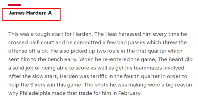 具体评价是:“对哈登来说,这是一个艰难的开局,他每次通过半场时,热火都会骚扰他,他有过几次糟糕的传球,进攻有些时候,首节就犯规两次,早早坐上替补席。不过,当他重新进入比赛后,大胡子在个人得分和让队友参与方面做得很好。虽然开局状态进入有点慢,但他在第四节发挥出色,帮助76人赢下比赛。他在末节投进的那些球,是费城二月份换来他的重要原因。”