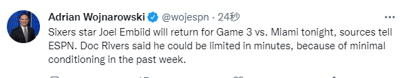 目前76人大比分0-2落后热火,队史季后赛13次0-2落后最终全都被淘汰;76人已经被逼入绝境,因此恩比德决定带伤复出,今年季后赛,恩比德已经出战6场比赛,场均拿到26.2分11.3篮板2.3助攻;究竟76人能否赢下G3捍卫主场,我们拭目以待。