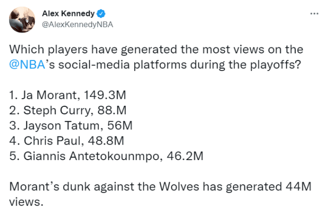 莫兰特实在太火了,因为经常上演高难度的拉杆和暴扣,被国内球迷戏称为“腰王”。Alex Kennedy还表示,单是莫兰特对森林狼那记精彩的隔扣,就收获了4400万浏览量,几乎相当于字母哥(4620万)季后赛所有官方视频的总流量了!