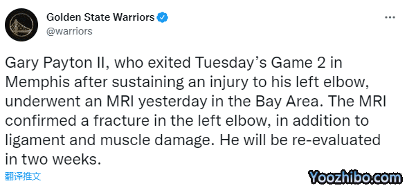 来源:JRS直播05-06 10:54JRS直播05月06日讯 ,勇士官方宣布,小佩顿不仅左手肘骨折,同时出现韧带和肌肉损伤,他将在两周后接受复查,换句话说,小佩顿至少伤停2周,因伤缺席西部半决赛剩余的比赛,而且没有具体复出时间表。