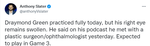 另外格林参加了完整训练,他的眼睛仍旧肿胀,昨天会见了一名医学专家,预计他将出战系列赛第三场比赛;目前勇士大比分1-1灰熊,G3将在大通中心开打。