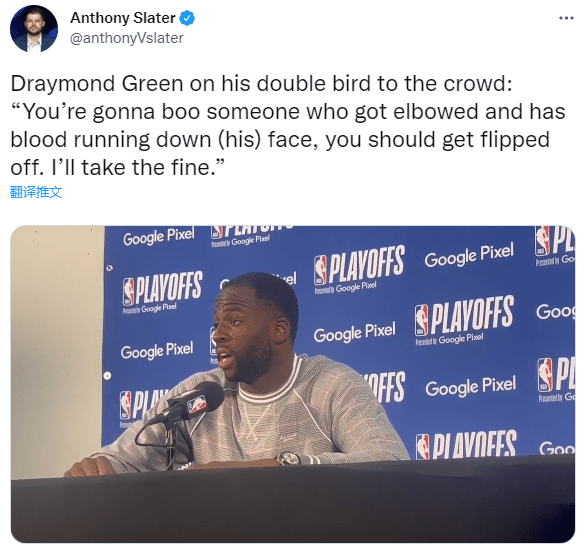 来源:JRS直播05-04 15:44JRS直播05月04日讯 ,西部半决赛G2勇士不敌灰熊,今日一战勇士太惨,小佩顿惨遭恶犯而提前伤退,伤情确诊为手肘骨折;库里手指流血所幸无碍,格林惨遭肘击,右眼附近撕裂流血,离场时竖中指回应被嘘;赛后格林回应此事,透露竖中指真因,并且表示愿为此交罚款。