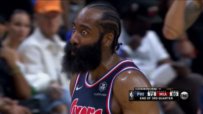 76人惨败热火!哈登13中5气得怒瞪队友泄愤,末节溃败提前投降
