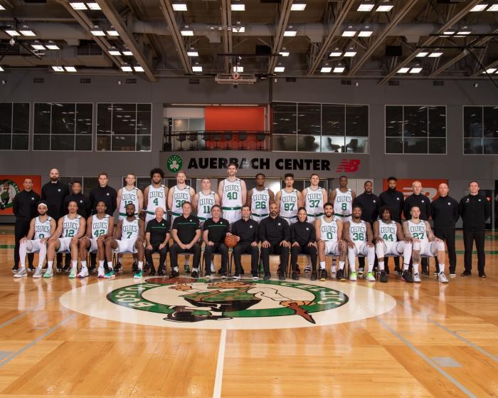 第一排的球员依次是:德里克-怀特、格威、霍福德、杰伦-布朗、塔图姆、斯玛特、罗威和泰斯;前排还坐着球队高管和主帅,凯尔特人老板斯蒂芬-帕柳卡和绿军篮球运营总裁史蒂文斯坐在C位,两人都摸着篮球,绿军主帅乌度卡坐在史蒂文斯左侧。