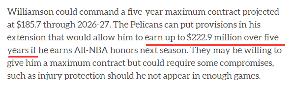 Yossi Gozlan表示,锡安能与鹈鹕续签一份5年1.857亿美元的合同,且鹈鹕可在其合同内加入如果锡安在下赛季入选最佳阵容(1-3阵均可)最高薪资达到5年2.229亿美元的条款;该薪资专家还表示,鹈鹕可能会愿意给锡安一份顶薪合同,但球员需要做出一些妥协,例如在合同内加入出战场次的限制条款。