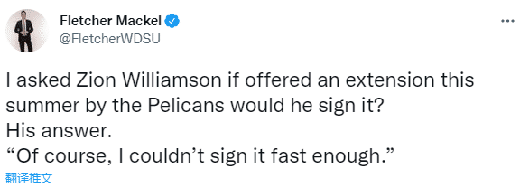 谈到是否愿意和鹈鹕提前续约,锡安表示:当然了,我签得还不够快。