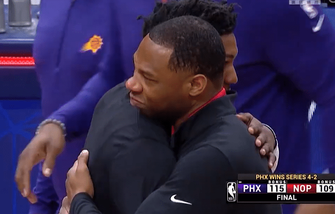 赛后,双方主帅拥抱。太阳主帅蒙蒂威廉姆斯和威利格林也是师徒,两人在当年的新奥尔良黄蜂时期,就已经有过合作。如今,两人各为其主,但当胜负已分,他们还是紧紧拥抱。随后,威利格林显然已经有些控制不住情绪,流下了男儿泪。