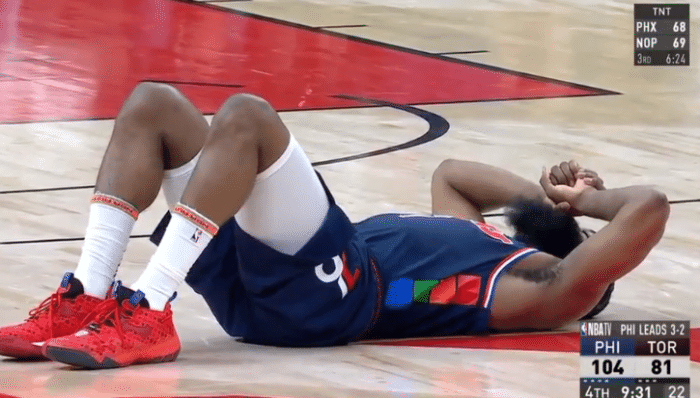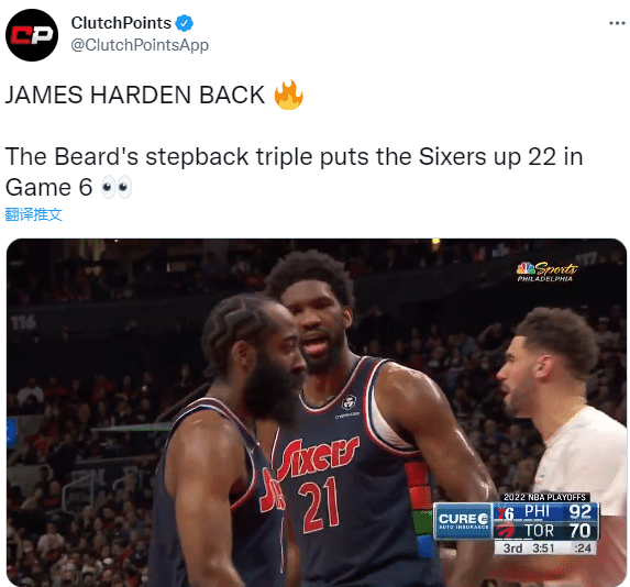 下半场,猛龙集体断电,76人在4分钟打出17-0超级攻势,猛龙艰难得分,哈登投进招牌后撤步三分,仰天怒吼庆祝,美媒直呼哈登回来了,此时76人领先猛龙22分;哈登继续助攻串联队友,打着打着恩比德和布歇有点小摩擦,猛龙全场球迷怒骂恩比德,大帝掩耳示意球迷再大声点,第三节最后一攻,恩比德大帽后冲猛龙球迷摇手指。