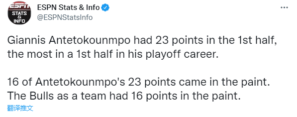 字母哥上半场23分创生涯季后赛上半场最高得分,23分中有16分来自禁区,与公牛全队禁区得分持平。