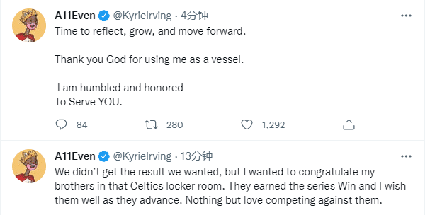篮网艰难杀进季后赛,却首轮0-4被凯尔特人横扫出局,不久前,篮网球星欧文发推表达出局的遗憾,与此同时欧文还恭喜凯尔特人晋级。