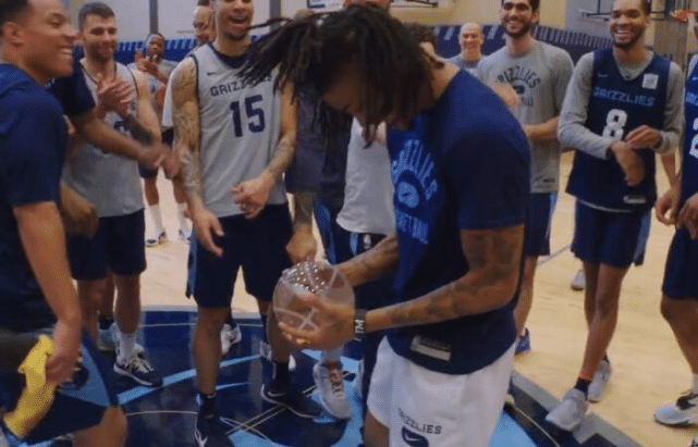 莫兰特在训练时得到了这一消息。主帅詹金斯点名莫兰特,通告全队莫兰特得到了2021-22赛季的进步最快球员奖,队友贝恩把奖杯送到了莫兰特的手中,队友们一阵欢呼后围着莫兰特庆祝!气氛非常欢快!