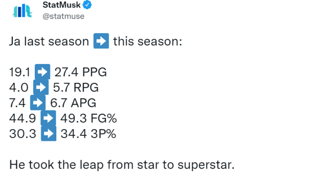 美媒StatMusk晒出莫兰特的两季数据对比,表示:他从球星变成了超级球星。上赛季,莫兰特场均19.1分4篮板7.4助攻,投篮命中率44.9%,三分命中率30.3%,而本赛季,莫兰特场均27.4分5.7篮板6.7助攻,投篮命中率49.3%,三分命中率34.4%。