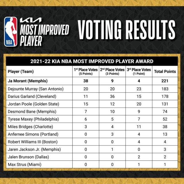 随后官方公布了票数得分,莫兰特221分排名第一,马刺的穆雷183分位居第二,排名第三的是骑士的加兰(178分)。勇士的普尔得到131分,排名第四。其他得到票数的球员包括贝恩,马克西,布里奇斯,西蒙斯,罗威、小杰克逊、布伦森和斯特鲁斯。莫兰特得到了38张第一选票,9张第二选票和4张第三选票。