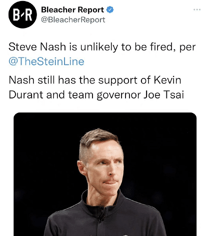 据悉蔡崇信还是很信赖主帅纳什的,纳什极有可能留任,与杜兰特和蔡崇信的支持有很大的关系,虽然连续2个赛季坐拥超级豪华的阵容,但纳什的成绩单仅仅是止步于次轮和首轮,确实很糟糕。