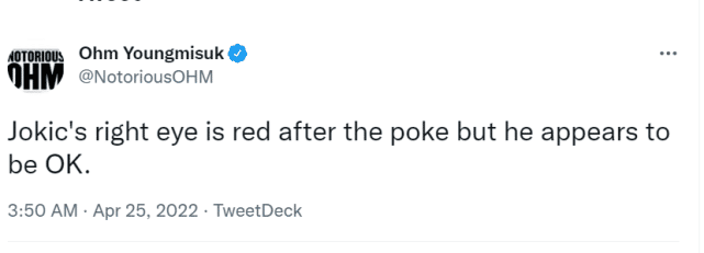 开场仅仅40秒,格林的动作就引来了双方的火药味。美媒跟进报道称,约基奇的眼睛变红了。这一幕很容易让人想起格林当年对詹姆斯的一个戳眼动作,让詹姆斯的眼睛也红了。