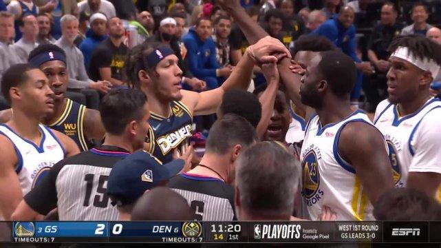 来源:JRS直播04-25 11:30JRS直播04月25日讯 ,勇士和掘金打响季后赛第4战,比赛刚开始40秒,火药味就来了!格林在防守中戳到约基奇的眼睛,随后,戈登上前为队友打抱不平,和格林发生口角,双方还险些干架,最终,裁判给了格林和戈登各一次技术犯规!