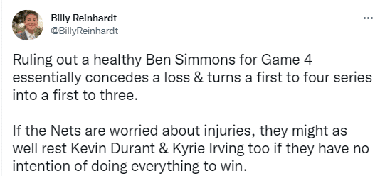 篮网记者BillyReinhardt发推:如果篮网担心伤病,如果他们不打算全力以赴,他们不妨让杜兰特和欧文也休战。