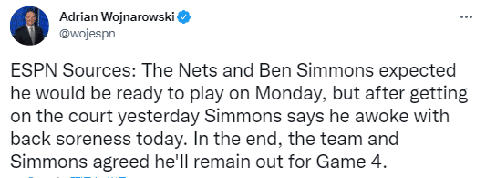 ESPN名记沃纳罗斯基跟进报道,篮网队和本-西蒙斯原本都预计会在G4复出,可昨天进行了训练之后,西蒙斯今天早上醒来说他的背部疼痛复发,最终篮网队和本-西蒙斯达成一致,西蒙斯继续缺席比赛。