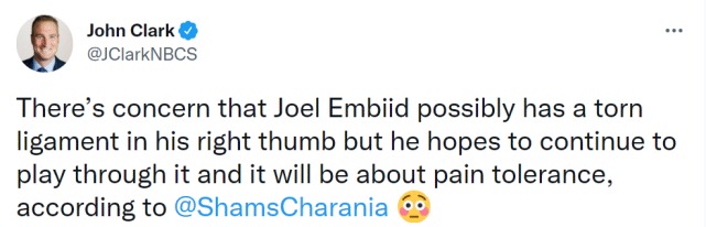 恩比德恐遭拇指韧带撕裂,表态要带伤作战