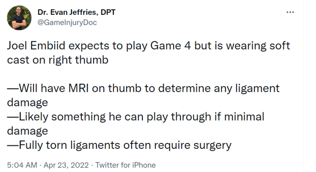 “我不知道发生了什么,但我开始感觉到疼痛,可能扭了一下,”G3赢下比赛后,恩比德曾谈到自己的拇指问题。他还表态这个伤病绝对不会影响他出战G4的比赛。医学专家表示,如果韧带损伤不大,可以坚持上场,但如果韧带完全撕裂,通常就需要手术治疗。