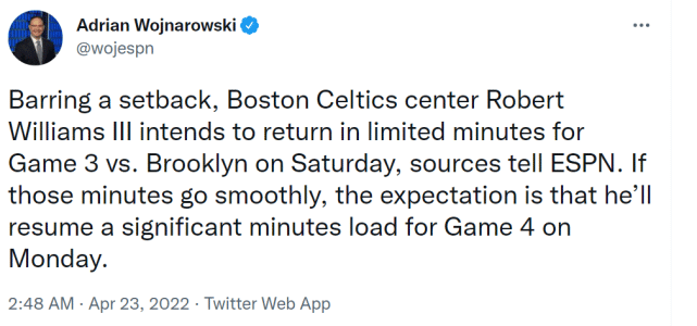 名记沃纳罗斯基报道称,绿军主力中锋罗伯特-威廉姆斯计划在G3复出,除非伤情出现反复。他将会有出场时间限制。沃纳罗斯基还表示,如果在G3上场的时间内打得顺利的话,那罗威在G4的出场时间会大量增加。