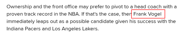 美媒Bleacher Report第一时间讨论黄蜂新帅的人选,并列出了潜在的三大候选人。Bleacher Report表示,管理层更倾向于聘用一位有良好执教表现的主帅。考虑到这一点,此前在步行者和湖人担任过主帅的沃格尔,很可能会第一时间成为候选人。