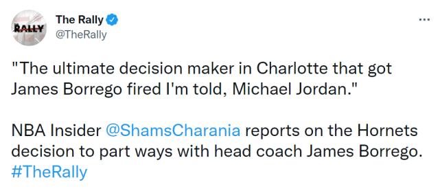 名记查拉尼亚在节目上透露,“内部人士透露,解雇博雷戈的最终决策者是球队老板迈克尔-乔丹。”换言之,是乔丹做出了让博雷戈下课的决定。执教4年却始终无缘季后赛,黄蜂总需要一个人出来担责,而这个人就是博雷戈。博雷戈成为了本赛季第三位下课的主教练,此前两位分别是湖人队的沃格尔和国王队的金特里。