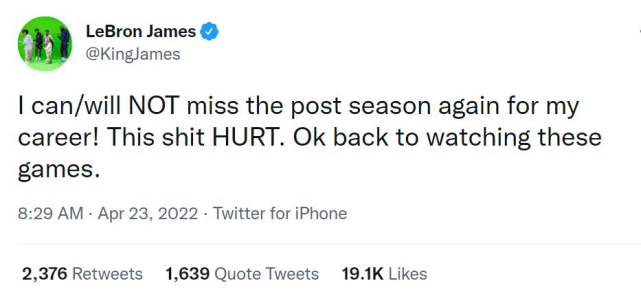 来源:JRS直播04-23 12:10JRS直播04月23日讯 ,湖人球星勒布朗-詹姆斯突然发推,在社媒上写道:“我生涯不能、也不会再错过季后赛!这TMD太让人心痛了!好了,继续看比赛!”最近一段时间,詹姆斯多次在社媒上对季后赛进行点评,湖人无缘季后赛,但詹姆斯没有停止对季后赛的关注。