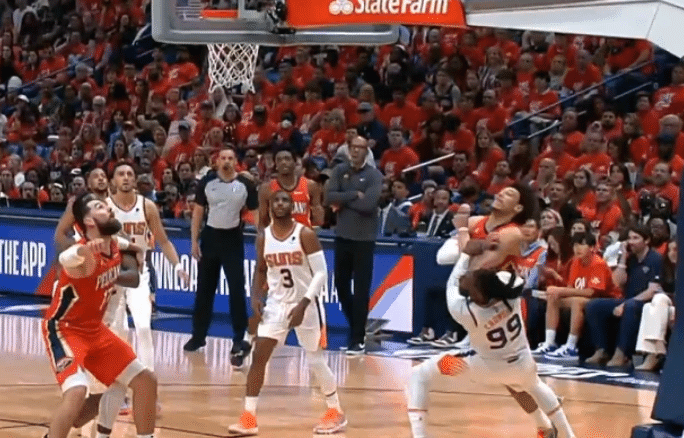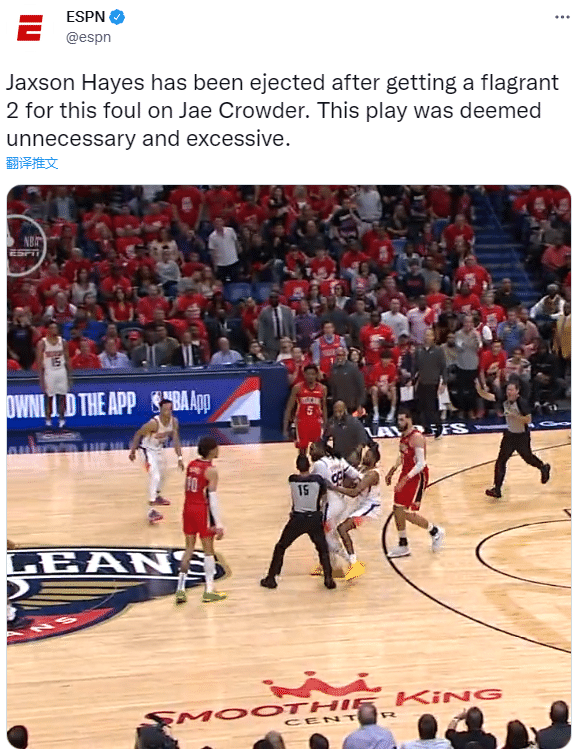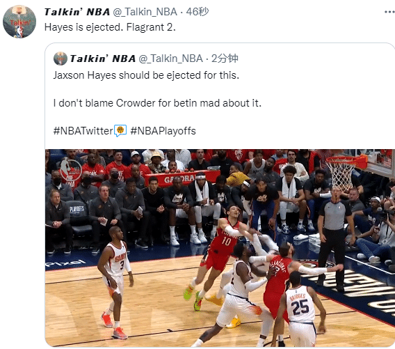 来源:JRS直播04-23 11:25JRS直播04月23日讯,NBA季后赛太阳再战鹈鹕,第二节场上发生意外事件,鹈鹕球员海耶斯推倒克劳德险引冲突,吃到二级恶意犯规直接被驱逐离场,克劳德吃到技术犯规。