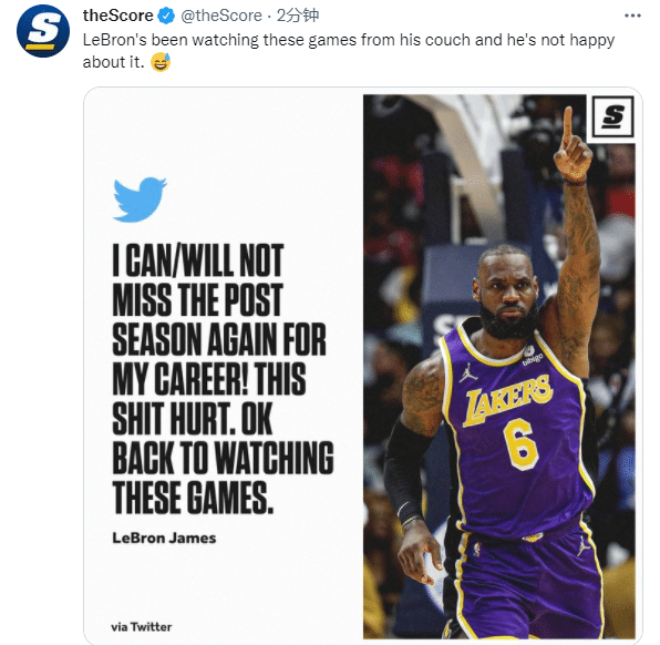 美媒SportsCenter发推:国王不习惯在家中看季后赛;TheScore发推:勒布朗一直坐在沙发上看季后赛,他对此十分不开心;美媒《露天看台》发推:勒布朗发誓再也不会错过季后赛。
