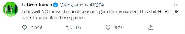 詹姆斯承诺再也不会错过季后赛,并且爆粗口透露在屏幕前看季后赛的心情太难受;如此动态瞬间引热议,不到一个小时,詹姆斯的动态已经获得5.7万点赞、1万次转推以及几千条评论;众美媒疯狂转发詹姆斯的推文。
