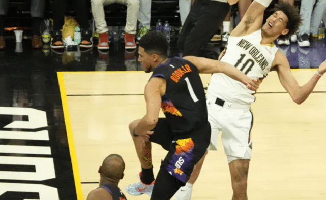 布克在G2的上半场表现出色,轰下31分和7个三分球,但他在第三节还剩4分45秒时,布克在回防海耶斯的一次扣篮时,拉伤了腿筋。他立刻请求暂停,然后返回更衣室检查,随后虽然回到替补席,但不再出战。很快,太阳官方宣布布克腿筋受伤,不会在这场比赛里继续上场。鹈鹕125-114击败太阳,拿走了G2的胜利。