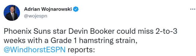 布克腿筋一级拉伤!休战2-3周,医学专家:受伤或与上场时间有关