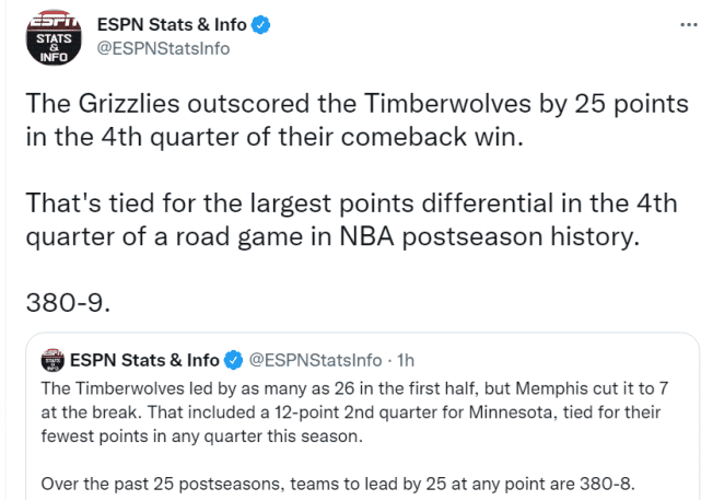 ESPN数据显示,森林狼上半场最多领先26分,灰熊在中场结束时缩小到7分,他们让森林狼第二节只得到12分。第三节,森林狼一度又将分差拉开到20+,但灰熊不放弃,完成了神奇的逆转。过去25年季后赛,领先25分的情况一共出现了389场(算上今天这场),其中只有9场逆转成功,而灰熊成为了第9支逆转成功的球队!他们还追平末节逆转最大分差纪录。